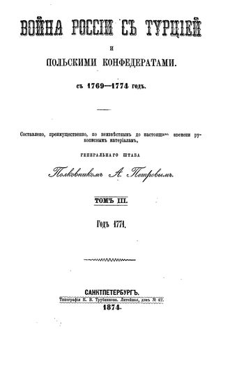 Война России с Турцией и польскими конфедератами. С 1769–1774 г. / Сост., преимущественно, из неизвест. по сие время, рукопис. материалов, Ген. штаба кап. А. Петровым. Т. 1–5. Т. 3 : Год 1771. — Санкт-Петербург : тип. К.В. Трубникова, 1874. — [4], IV, 323 с., 11 л. план.