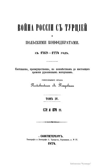 Война России с Турцией и польскими конфедератами. С 1769–1774 г. / Сост., преимущественно, из неизвест. по сие время, рукопис. материалов, Ген. штаба кап. А. Петровым. Т. 1–5. Т. 4 : 1772 и 1773 гг. — Санкт-Петербург : тип. и лит. А.Траншеля, 1874. — IV, 234, [2], 157 с., 8 л. план.