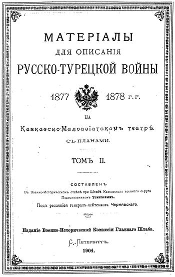 Материалы для описания русско-турецкой войны 1877–1878 гг. на Кавказско-Малоазиатском театре : С пл. / Сост. в Воен.-ист. отд. Штаба Кавк. воен. кор. под ред. ген.-лейт. Чернявского. Т. 1–. Т. 2 : [Военные действия главных сил Действующего корпуса и соединенных Саганлугского и Эриванского отрядов] / Сост.... подполк. Томкеевым. — 1904. — 460, 264 с.