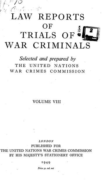 Law reports of trials of war criminals : United Nations War Crimes Commission. Volume VIII. — London: Majesty's stationery office, 1949. — 92 p.