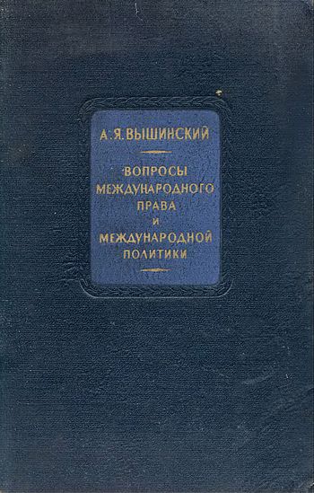 Вышинский А. Я. Вопросы международного права и международной политики: [Том 1]: Парижская мирная конференция 1946 года. — Выступления на заседаниях Совета Безопасности Организации Объединенных Наций в 1946 году — Генеральная Ассамблея Организации Объединенных Наций. Первая сессия 1946 года — Генеральная Ассамблея Организации Объединенных Наций. Вторая сессия 1947 года — Выступления на банкетах, пресс-конференциях и митингах. / акад. А. Я. Вышинский ; Всесоюз. ин-т юрид. наук М-ва юстиции СССР. — Москва : Гос. изд-во юрид. лит., 1949. — 504 с.; 23 см. — 20 000 экз. — 18 р. 40 к.