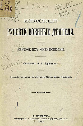 Тарапыгин Ф. А. Известные русские военные деятели : Крат. их жизнеописание / Сост. Ф.А. Тарапыгин ; Ред. Ген. штаба ген.-майора Влад. Пруссака. — Санкт-Петербург : тип. И.В. Леонтьева, 1911. — II, 190 с., 3 л. ил. : ил. ; 23 см.