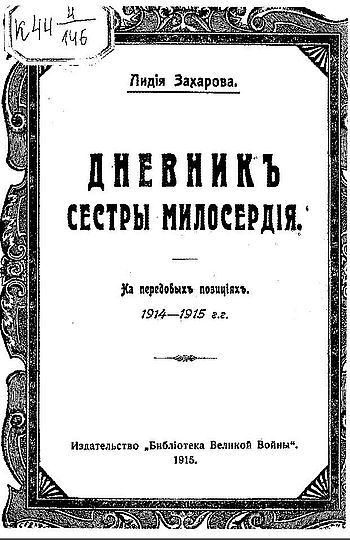 Захарова Л. Дневник сестры милосердия : На передовых позициях : 1914-1915 гг. — Пг.: Библиотека Великой войны, 1915. — 173 с.