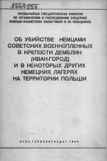 Об убийстве немцами советских военнопленных в крепости Демблин (Иван-Город) и в некоторых других немецких лагерях на территории Польши: Док. и фотоснимки / Чрезвычайная Государственная Комиссия по установлению и расследованию злодеяний немецко-фашистских захватчиков и их сообщников. — [М.]: ОГИЗ; Госполитиздат, 1948. — 46 с.