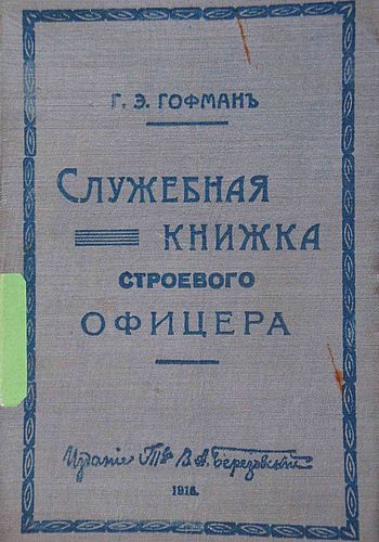 Гоффман Г. Э. Служебная книжка строевого офицера / Г.Э. Гоффман. — 19-е изд., испр. и доп. всеми законоположениями и разъяснениями, объявленными по 1-е мая 1916 г. И. Защук. — Петроград : т-во В.А. Березовский, 1916. — VIII, 424 с. ; 21 см. — 1 р. 50 к. (1 р. 85 к. в пер.).