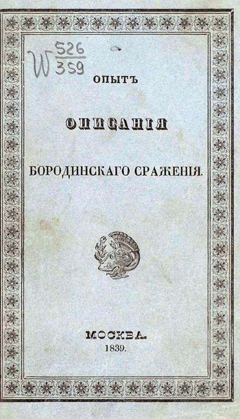 Неелов Н. Д. Опыт описания Бородинского сражения / [Соч.] Сост. при Штабе 6 Пехот. корпуса Ген. штаба поручика Неелова. — Москва : тип. Н. Степанова, 1839. — 135 с., 1 л. фронт. (ил.), 1 л. план. ; 17 см.