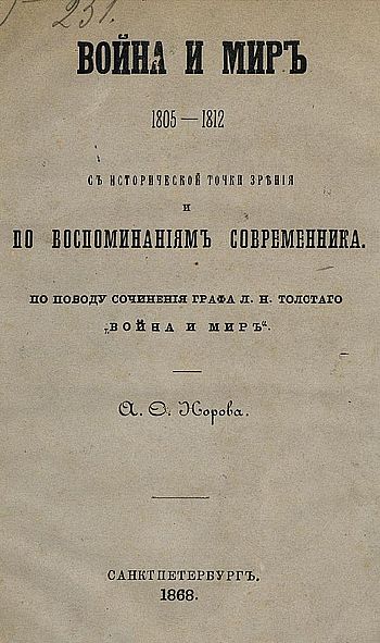 Норов А. С. Война и мир 1805–1812 с исторической точки зрения и по воспоминаниям современника : по поводу сочинения графа Л.Н. Толстого «Война и мир» / [соч.] А.С. Норова. — Санкт-Петербург : типография Департамента уделов, 1868. — [2], 58 с. ; 24 см. — В изд. 1903 г. в подзаг.:... Авраама Сергеевича Норова. Из № 11 «Воен. сб.» 1868 г. [Эл.копия создана на основе экземпляра РГБ].