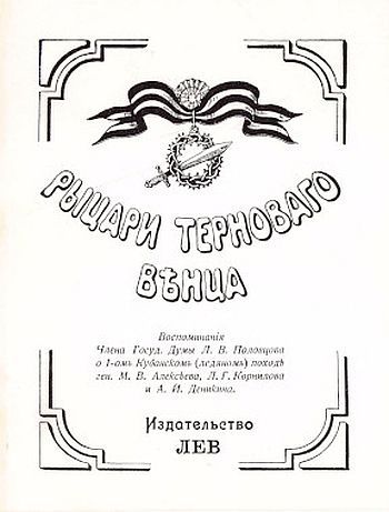 Половцов Л. В. Рыцари тернового венца. Воспоминания Члена Госуд. Думы Л. В. Половцова о 1-ом Кубанском (ледяном) походе ген. М. В.Алексеева, Л. Г.Корнилова и А. И.Деникина. — Париж, ЛЕВ, 1980. — 220 с.