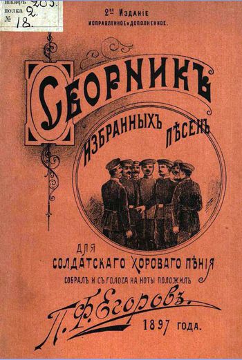 Сборник избранных песен для солдатского хорового пения [Ноты] / собрал и с голоса на ноты положил П. Ф. Егоров. — 2-ое издание, исправленное и дополненное. — [Екатеринослав] : [изд. авт. [П. Ф. Егоров]], 1897 (лит. В. Гроссе ; Москва). — 79 с.: ил.; 25 см. — На с. 1: оглавление. На с. 2–3: предисл. и стихотворение авт.