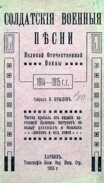 Солдатские военные песни Великой Отечественной войны 1914–1915 г.г / Собрал В. Крылов. — Харбин : типо-лит. Заамур. округа погран. стражи, 1915. — 71 с.; 17 см.
