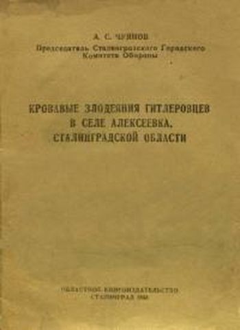 Чуянов А. С. Кровавые злодеяния гитлеровцев в селе Алексеевка, Сталинградской области / А.С. Чуянов, пред. Сталингр. гор. ком. обороны. — Сталинград : Обл. книгоизд-во, 1943. — 11 с. Без обл. ; 15 см.
