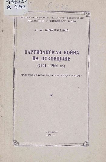 Виноградов И. В. Партизанская война на Псковщине (1941–1944 годов) [Текст] : [Расшир. стенограмма лекции] / И. В. Виноградов. — [Псков] : Псковиздат, 1950 (тип. «Псков. правда»). — 55 с.; 20 см. — (В помощь районному и сельскому лектору / Псков. обл. отд. культпросветработы. Обл. лекционное бюро).