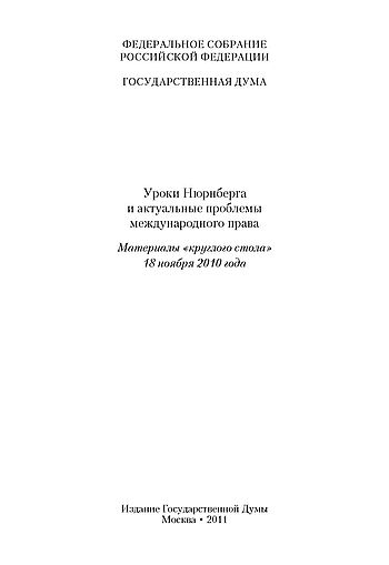 Уроки Нюрнберга и актуальные проблемы международного права : материалы «круглого стола» 18 ноября 2010 г / [сост.: Д.Л. Пчеляков ; под общ. ред. к.ю.н. К.И. Косачева]. — Москва : издание Государственной Думы, 2011. — 118, [1] с. : ил., факс. ; 24 см.. — Библиогр.: с. 110–115. — 500 экз.