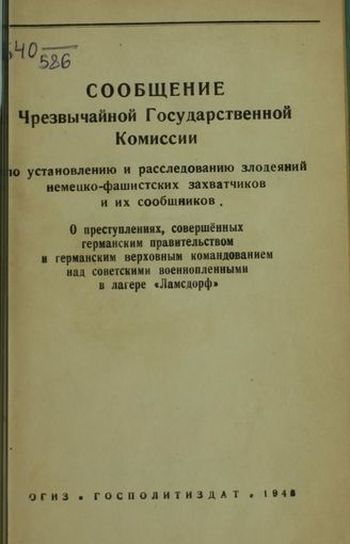 Сообщение Чрезвычайной Государственной Комиссии по установлению и расследованию злодеяний немецко-фашистских захватчиков и их сообщников. О преступлениях, совершенных германским правительством и германским верховным командованием над советскими военнопленными в лагере «Ламсдорф». — М.: ОГИЗ; Госполитиздат, 1946. — 34 с.