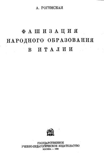 Рогинская А. С. Фашизация народного образования в Италии / А. Рогинская. — Москва : Гос. учеб.-пед. изд-во, 1933 ("Образцовая" тип.). — Обл., 70, [2] с.; 20х14 см. — Библиогр.: "Библиография" (с. 68-71)/ — 5000 экз.
