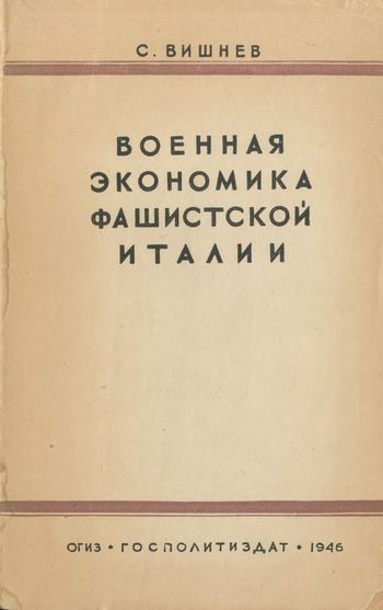 Вишнев С. М. Военная экономика фашистской Италии / Под ред. акад. И.А. Трахтенберга ; Акад. наук СССР. Ин-т мирового хоз-ва и мировой политики. — [Москва] : Госполитиздат, 1946. — 139 с.; 22 см.