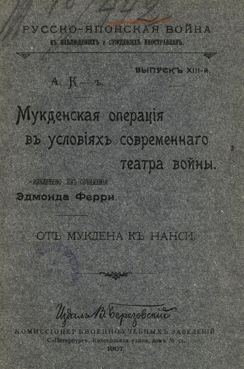 Ферри Э. Мукденская операция в условиях современного театра войны : Извлеч. из соч. Эдмонда Ферри От Мукдена и к Нанси / [Пер. А. К-ъ]. — 1907. — 24 с. — (Русско-Японская война в наблюдениях и суждениях иностранцев ; Вып. 13)