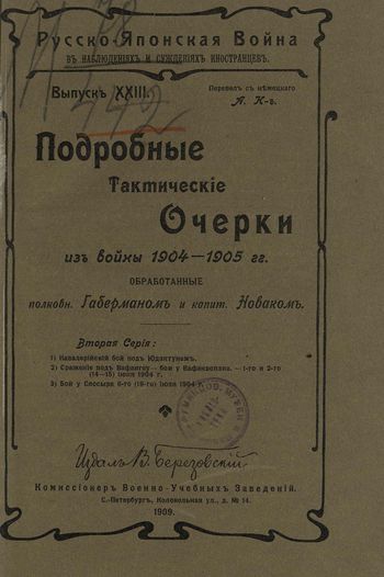 Габерман Г. Э., Новак И. Подробные тактические очерки из войны 1904-1906 гг : 2-я серия / обработанные полковником Габерманом и капитаном Новаком ; пер. с нем. А.К.-ъ. — С.-Петербург : В. Березовский, 1909. — [4], 60 с., 12 л. карт.; 21 см. — (Русско-японская война в наблюдениях и суждениях иностранцев ; вып. 23)