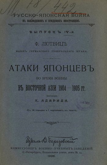 Люттвиц Ф. Атаки японцев во время войны в Восточной Азии 1904-1905 гг / Ф. Люттвиц, майор Герм. ген. штаба ; Пер. К. Адариди. — Санкт-Петербург : В. Березовский, 1906. — [4], 53 с., 14 л. карт.: черт.; 21 см. — (Русско-Японская война в наблюдениях и суждениях иностранцев ; Вып. 4). — 75 к.